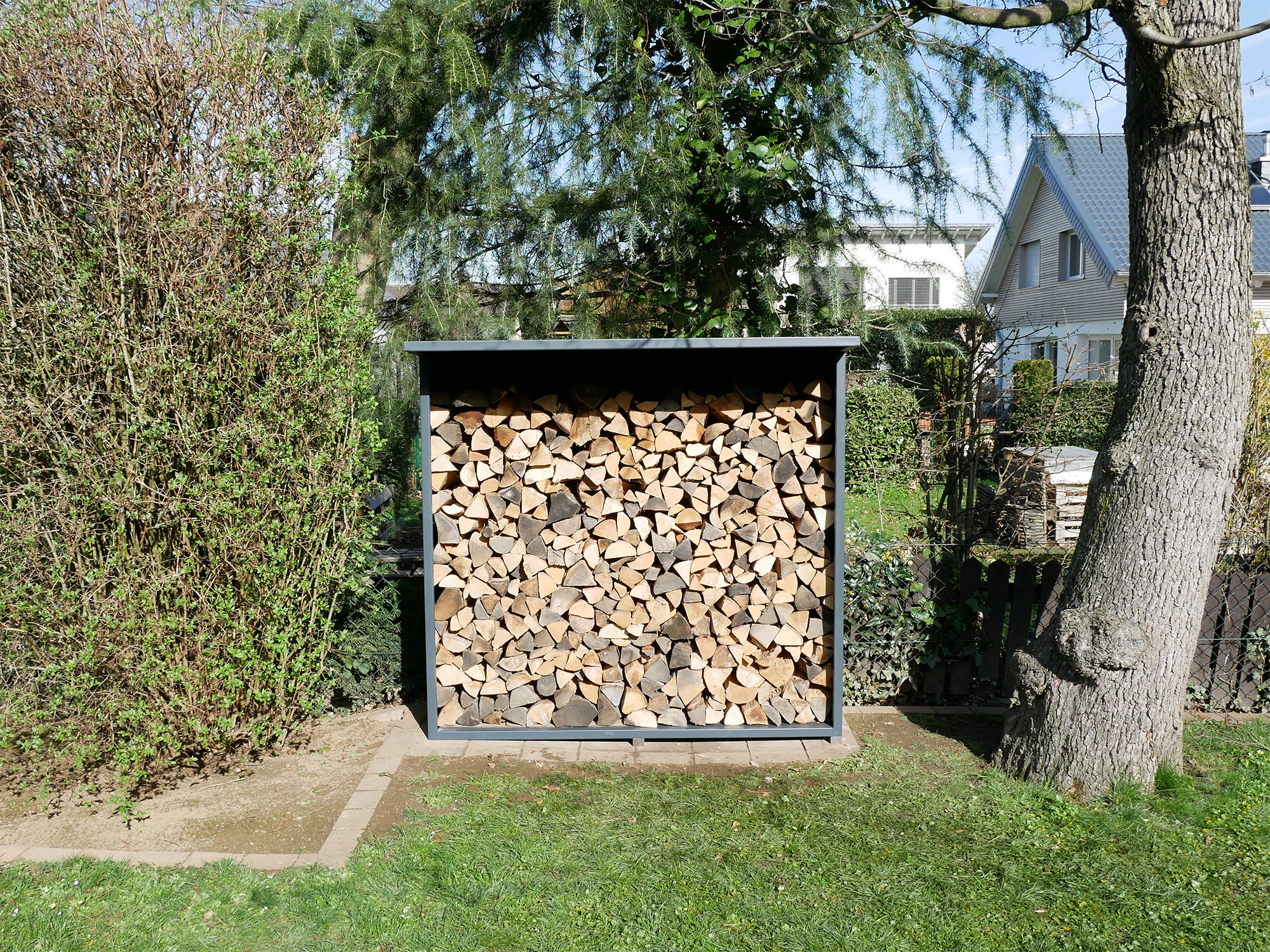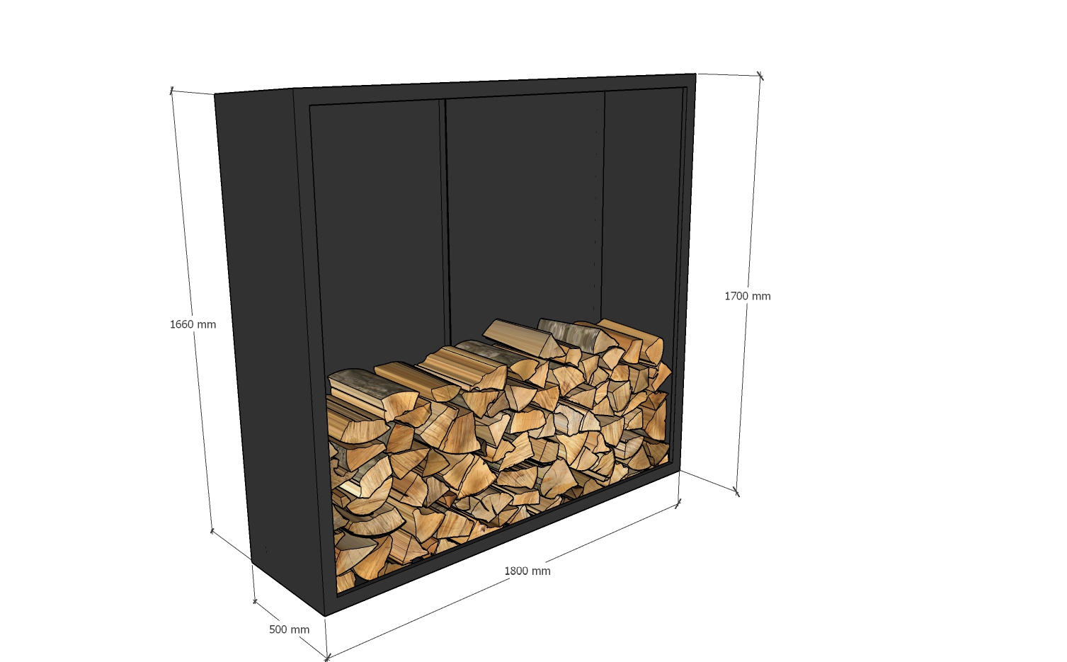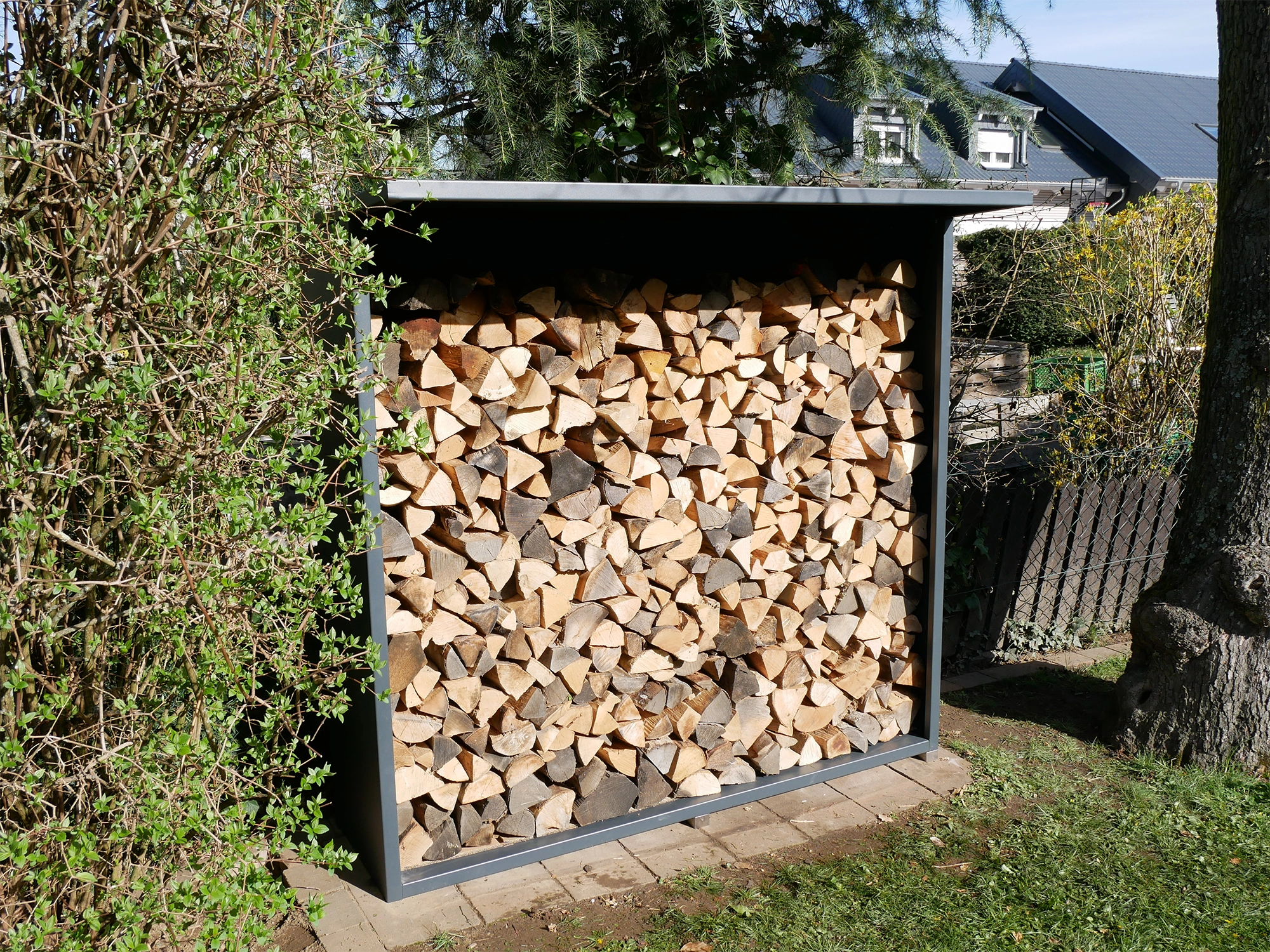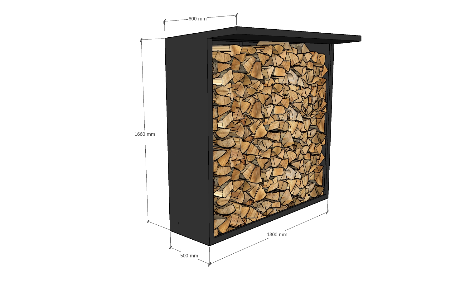 Mit seinen Außenmaßen von ca. 180x175x50 cm (BxHxT) bietet unser Holzlager Stauraum für eine Menge Holz. So sind viele gemütliche Kaminabende gesichert.