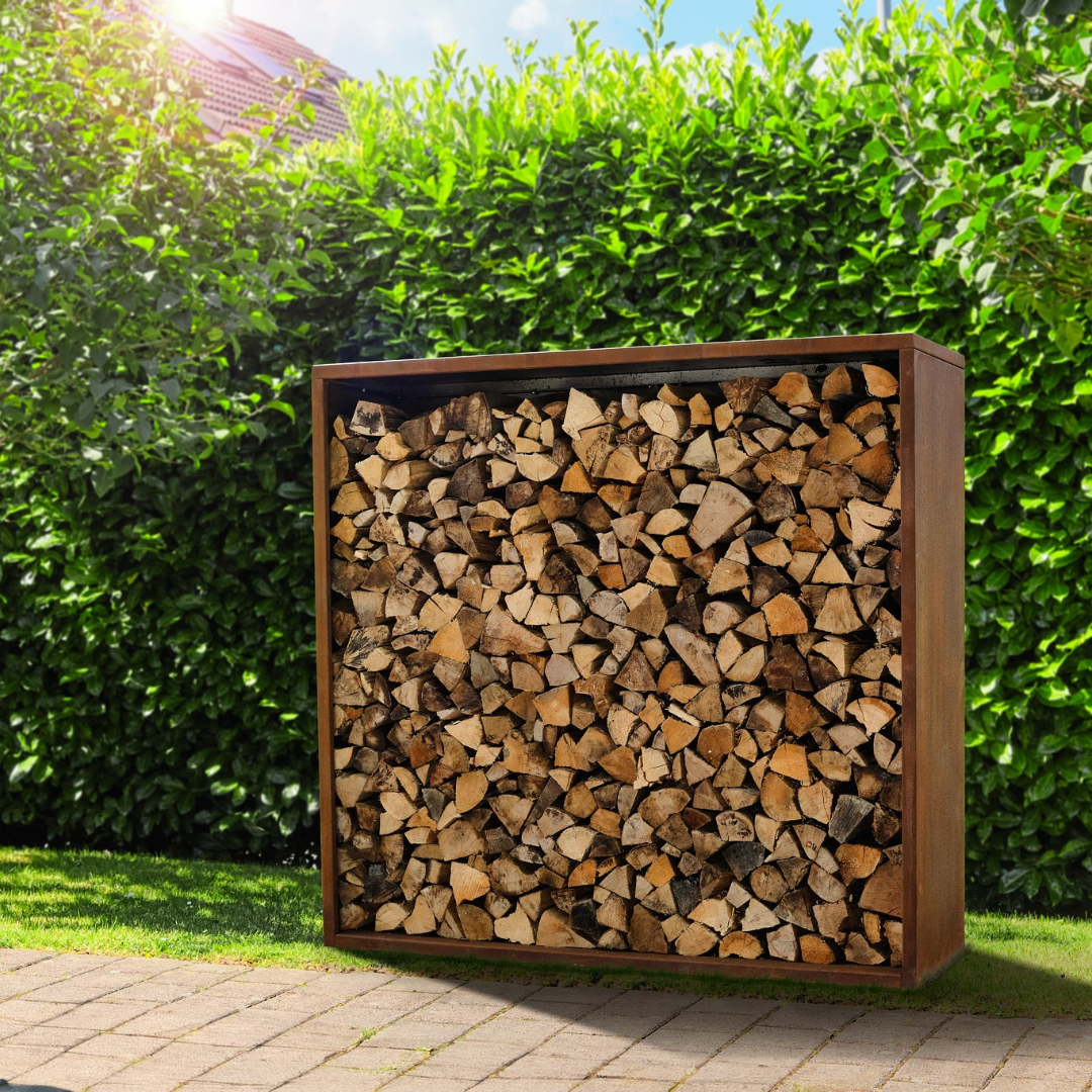 HOLZLAGER CORTEN – ein architektonisches Design-Holzlager aus wetterfestem Cortenstahl. Mit seiner massiven Konstruktion und klaren Linien fügt es sich harmonisch in moderne Außenbereiche ein. Das Modell ist in Varianten mit oder ohne Vordach erhältlich und bietet Platz für ordentlich gestapeltes Brennholz – geschützt und stilvoll zugleich.